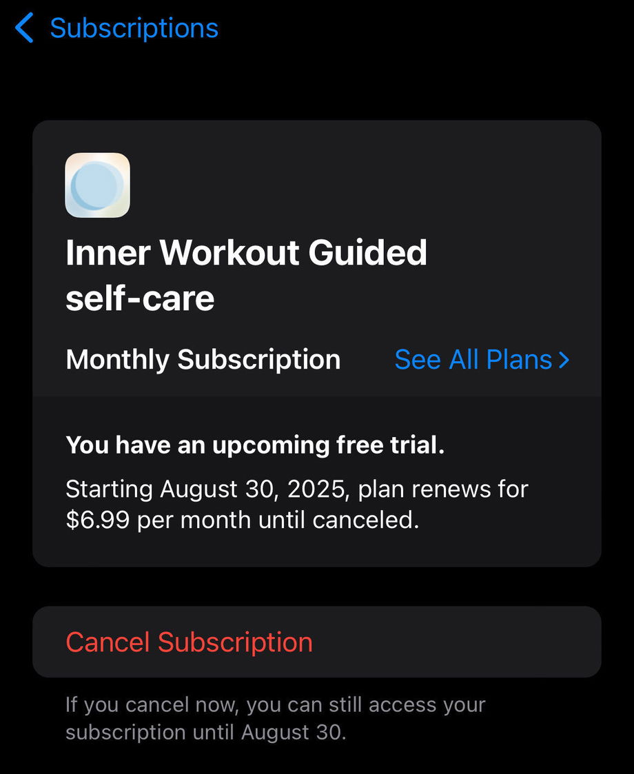 Thanks for trying the Inner Workout app. We trust you to do what's best for you, even if that means cancelling your subscription. 🥲