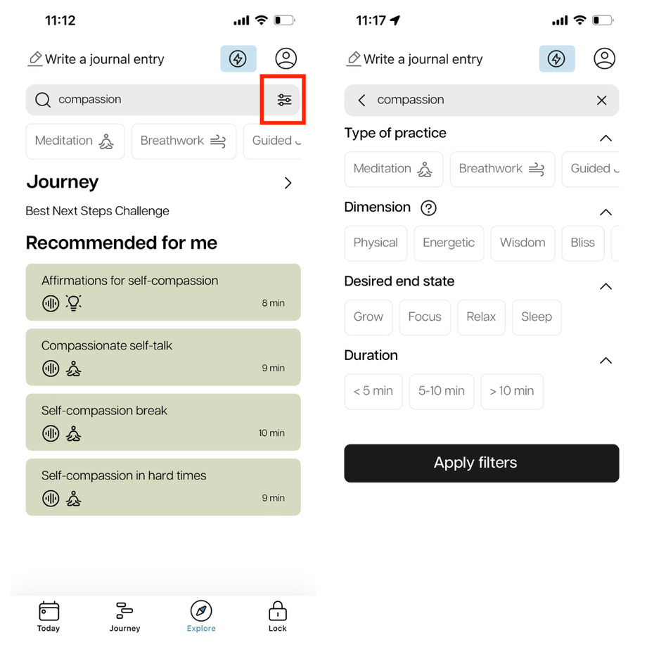 To get more specific, you can click the filter icon to narrow down the type of practice, Dimension of Well-being, desired end state, or duration.